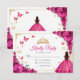 Fuchsia pink, gold and white Quinceanera RSVP reply card. Features brunette girl in ball gown dress, script font, gold butterflies, hot pink roses and tiara. Perfect for an elegant princess style glam celebration. Personalize with your own details.