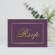 Cette élégante carte RSVP de mariage présente un faux script classique en or qui dit "RSVP" encadré dans une bordure en or sur un arrière - plan prune violet. Le dos de la carte contient tous vos détails RSVP en calligraphie noire sur un arrière - plan brillant en faux or. Consultez notre boutique I Love Weddingz pour en savoir plus sur cette collection. Conçu par Susan Coffey.