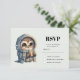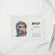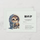 Carte RSVP avec une jolie illustration d'un chouette en robe d'hiver et foulard tenant un café chaud.