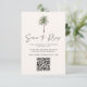 Carte RSVP de mariage tropical avec une illustration d'un palmier unique en haut du design avec un arrière - plan en ivoire. "Analyser vers RSVP" s'affiche dans un script manuscrit noir avec la date de réponse souhaitée, les instructions de code QR et le site Web du mariage. Ajoutez votre site Web mariage au code QR afin que vous puissiez facilement scanner et être directement amené à la page RSVP de votre site mariage. La carte RSVP de code QR de palmier a été conçue pour être coordonnée avec notre collection Minimal Palm Tree mariage.