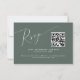 Carte RSVP de mariage élégante et minimale avec un texte de script moderne en haut avec un code QR sur un arrière - plan vert forêt. Ce design simple fonctionnera pour n'importe quelle saison. La carte comprend également des options de choix de repas pour les clients à choisir parmi.
