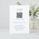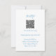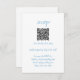 Ajoutez une touche de fantaisie et répondez à votre faire-part de mariage sans effort et élégante avec cette carte RSVP Mariage QR Code bleu clair. Conçu dans un format de 3,5 po x 5 po de taille parfaite, embrassez l'esprit d'amusement et d'individualité avec notre simple aquarelle manuscrite de charme et le design de mots RSVP ludique, le tout dans des tons clairs de bleu. Parfait pour les couples à la recherche d'une ambiance moderne et libre pour leurs fêtes de printemps, d'été ou d'hiver, ce qui en fait un ajout sans faille à votre suite de papeterie mariage. Entièrement personnalisable, cette carte RSVP dispose d'un modèle convivial qui permet à vos invités de répondre rapidement, de simplement scanner le code QR ou de choisir parmi plusieurs options RSVP, y compris votre site Web mariage, votre courriel ou votre téléphone. Cette approche rationalisée assure une expérience sans stress tout en gardant vos détails mariages parfaitement coordonnés. Complétant notre collection de faire-part de mariage fantaisistes, cette carte RSVP vous assure une expérience cohésive et délicieuse pour vous et vos invités. Laissez votre personnalité briller dans chaque détail de votre journée spéciale avec notre modèle personnalisable. Choisissez des images inégales de la même collection pour une sensation plus ludique. Débloquez la magie de votre voyage mariage avec notre carte RSVP fantaisiste - parce que chaque histoire d'amour mérite une touche d'enchantement. Commencez à créer votre fête de rêve dès aujourd'hui !