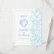 Dessin simple en bleu aqua d'une coquille de palourdes, avec des tourbillons d'onde graphique. Belle carte RSVP de mariage bleu vert sur blanc couleur mer pour accompagner les invitations de mariage. Un invitation idéal pour un mariage sur la plage, la côte inspirée par l'océan ou la mer. Modifiez ces réponses avec vos propres mots. Ondes uniques et dessin de coquille par Sarah Trett. www.sarahtrett.com pour www.mylittleedenweddings.com