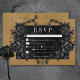 Transportez vos invités dans un monde d'élégance sombre et enchanteresse avec notre carte de réponse mariage gothique vintage. L'vieil arrière - plan d'or victorien ouvre la voie à un contraste saisissant, à mesure que le texte blanc gras émerge des zones de texte noir complexes. Au sommet de cette invitation, une frontière gothique tridimensionnelle ornée d'un corbeau noir royal capture l'essence du mystère et de l'amour. Le dos est orné de deux vignes entrelacées de roses noirs formant subtilement un coeur autour de deux corbeaux embrassant, ce qui ajoute une touche d'allure dramatique. Lance la magie et donne le ton pour une journée de mariage inoubliable. Cette carte fait partie de la suite gothique Black Raven & Black Rose Gold Mariage Suite créée par Simply Farmhouse Press.