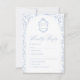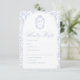 Soft Delft blue floral RSVP response card, designed in a refined blend of chinoiserie and French toile de Jouy style. The soft botanical illustrations frame an arched layout featuring an elegant wedding crest monogram, perfect for couples who love vintage, historic, and European-inspired aesthetics. Classic script typography pairs beautifully with the ceramic-blue palette, making this design an effortless nod to the tradition of “something blue.” Fully customizable with your RSVP date, guest name and menu choice, it’s an exquisite choice for any romantic or sophisticated wedding theme.