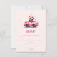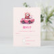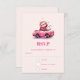 An RSVP card with an adorable illustration. A happy looking sloth sitting in a sporty pink convertible. Waving as he drives by. With hearts floating upwards.