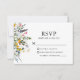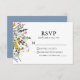 Carte RSVP Fleur sauvage Watercolor moderne comprend des fleurs sauvages jaunes, roses, violettes, bleues et blanches poussiéreuses, des feuilles d'eucalyptus, des feuilles verts sauge et d'autres plantes botaniques. Bleu Dusty Back.