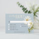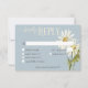 Présentez notre carte de réponse mariage de charme avec des options de dîner, conçu pour ajouter une touche d'élégance rustique à votre journée spéciale. Ce design exquis présente un arrière - plan bleu poussiéreux doux, complété par une délicate zone de texte blanche encadrée d'un cadre flottant mince. Décoré d'un étonnant spray d'aquarelle blanc et jaune marguerite et de délicats fleurs sauvages bleus, ce design donne le ton parfait pour votre célébration. Les teintes douces et le design rustique captent l'essence d'une romance campagnarde, ce qui en fait un choix idéal. Créé par Simply Farmhouse Press.