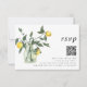 Ces magnifiques cartes de réponse de RSVP de mariage présentent une luxuriante disposition de verdure de citron aquarelle dans un pot, des couleurs jaune et vert. Un look floral de citrons d'été élégant sur un fond blanc simple, avec une typographie moderne et tourbillonnante. La carte de RSVP combinée comporte un code QR sur le devant, ainsi qu'une carte de RSVP traditionnelle au verso pour les invités qui préfèrent renvoyer leurs cartes par la poste.