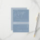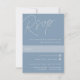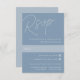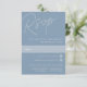 Conçu pour correspondre à nos invitations de mariage Script Watermark, cette carte RSVP basée sur la typographie élégante est parfaite pour les RSVP par courrier traditionnel. Le design comporte des lettres de script surdimensionnées en haut, en ton sur les tons pour un effet filigrane. Personnalisez avec votre date RSVP souhaitée et coutume acceptez et refusez le libellé dans les lettres serif classiques alignées en bas à droite, ainsi que les choix de repas ou les sélections d'entrées. Notre colorway bleu Dusty est un élégant mélange de bleus éthérés, avec des lettres blanches et bleues-grises sur un arrière - plan bleu moyen poussiéreux.