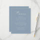 This dusty blue wedding details card offers a beautifully minimalist and elegant way to share important information with your guests. The clean layout, modern typography, and soft script accents create a refined, stylish look that complements any contemporary wedding suite. Perfect for reception directions, accommodations, and extra notes, it adds a polished finishing touch to your celebration stationery.