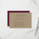 Cette élégante carte d'enceinte RSVP de mariage moderne présente du texte bordeaux sur un arrière - plan doré. Le titre "RSVP" apparaît dans un très beau script d'écriture manuscrite, avec le texte personnalisable ci-dessous dans la police sans serif. L'envers est bourgogne solide.