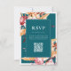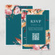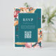 Cartes mariages de automne modernes rsvp avec élégantes touches florales boho automne de fleurs dahlia et feuilles botaniques d'automne, design typographique minimaliste sur arrière - plan turquoise. Ajoutez votre propre code QR personnalisé avec l'URL personnalisée du site de mariage.
