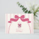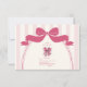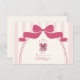 Coquette Pink Bow Graduation Carte RSVP Complétez votre invitation de graduation avec la Coquette Pink Bow Graduation Card RSVP, conçue pour ajouter une touche d'élégance et de charme à votre célébration. Dotée d'une délicate illustration d'arc rose, de tons pastel doux et d'une typographie raffinée, cette carte RSVP complète parfaitement un événement de graduation stylée et féminine. Caractéristiques : Coquette Chic Aesthétique - Un arc rose dainty et des détails doux et romantiques créent un look sophistiqué et intemporel. Détails personnalisables - Personnalisez avec votre nom, la date de l'événement, l'échéance RSVP et les options de réponse. Impression de haute qualité - Imprimée sur des cartons de qualité supérieure pour une finition poli et luxueuse. Typographie élégante - Une mise en page de police superbement guidée qui améliore le design raffiné de la carte. Options numériques et d'impression - Choisissez une version imprimable ou faites-la imprimer et livrer professionnellement. Cette carte RSVP est la touche finale parfaite de votre collection Coquette Pink Bow Graduation Collection, assurant une façon organisée et élégante de recueillir les réponses des invités. Commandez maintenant de créer un ensemble de papeterie de graduation magnifiquement coordonné.