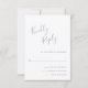 Carte RSVP de mariage simple avec "Kindly Reply" dans un élégant script manuscrit en haut à gauche et les choix de réponse ainsi que le nombre de participants en alignement droit en bas à droite. Tous les éléments de conception sont en bleu poussiéreux et peuvent être modifiés dans l'outil d'édition de conception. Le design minimaliste est agrémenté d'une touche romantique grâce au lettrage à la main chic.