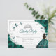 Emerald green silver and white Quinceanera RSVP reply card. Features brunette girl in ball gown dress, script font, silver butterflies, dark green roses and tiara. Perfect for an elegant princess style glam celebration. Personalize with your own details.