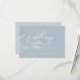 Carte RSVP de mariage | Des feuilles d'eucalyptus à aquarelle blanche grillent l'avant de cette carte bleue poussiéreuse. Calligraphie élégante en blanc avec détails dans une police contemporaine. Conception créée pour BarefootBride™ par © WhimsicalArtwork™ Personnaliser texte, style de police, couleur et taille. Nous avons créé ce modèle pour vous faciliter la personnalisation avec vos propres informations. Il fait partie de notre Dusty Blue Foliage Ivory Peonies Mariage Stationery Suite avec mariage, baby shower et autres articles de papeterie d'évènement correspondants.
