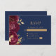 Cette élégante carte de mariage moderne RSVP présente des fleurs rouges bordeaux avec un feuillage en faux feuille d'or sur un bord. Le texte personnalisable de couleur or apparaît sur un arrière - plan bleu marine. L'envers est bleu marine solide.