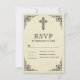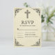 Elégante carte RSVP avec une élégante bordure noire et décorée croix contre un arrière - plan parchemin vintage.