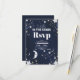 Cette élégante carte RSVP complète parfaitement un mariage à thème céleste, avec un design de lune de croissant raffiné comme élément central. La lune de croissant, ornée d'un accent doré complexe, est dressée contre un arrière - plan marin ou bleu nuit, rappelant un ciel nocturne tranquille. Des étoiles dorées éparpillées scintillent autour de la lune, ajoutant une touche de magie et de sophistication. Les détails RSVP sont présentés dans une combinaison de calligraphie moderne et de polices serif classiques, gravées dans une feuille d'or luxueuse pour correspondre aux éléments célestes. La carte offre une présentation claire et organisée pour répondre aux invités, avec des options pour accepter ou refuser l'invitation, ainsi que l'espace pour toutes préférences alimentaires ou demandes spéciales. Imprimée sur des cartons de qualité supérieure et lisses, la carte RSVP garde une allure haut de gamme, en s'assurant de s'aligner sur l'élégance générale de la suite de papeterie mariage. Le dos de la carte peut comporter une subtile continuation du motif étoilé ou un arrière - plan solide de la marine, complétant la conception cohésive. Cette carte RSVP sert non seulement un but pratique, mais elle met en valeur le thème céleste de votre mariage, laissant aux invités un sentiment d'anticipation pour une célébration magique et inoubliable.