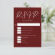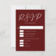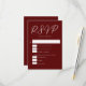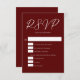 Cette carte RSVP de mariage bordeaux et robuste présente un script blanc classique avec vos choix de repas dans un lieu de soirée formel. Embrassez le romantisme avec cette couleur riche et audacieuse. Carte de réponse minimaliste et romantique pour un couple moderne.