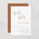 Carte RSVP de mariage simple avec "Kindly Reply" dans un élégant script manuscrit en haut à gauche et les choix de réponse ainsi que le nombre de participants en alignement droit en bas à droite. Tous les éléments de conception sont en terre cuite / orange brûlé / rouille et peuvent être changés dans l'outil de montage de conception. Le design minimaliste est agrémenté d'une touche romantique grâce au lettrage à la main chic.