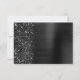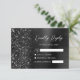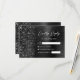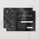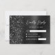 Cette élégante carte de mariage moderne RSVP comporte une bordure en parties scintillant en faux diamant noir sur un arrière - plan en métal brossé noir. Le texte est en écriture manuscrite moderne et sans serif police, avec des espaces pour les noms et réponses des invités. L'envers présente une conception en métal brossé noir et en parties scintillant.
