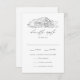 Cartes RSVP de mariage rustique avec une illustration noir esquissée d'une grange affichée en haut du dessin sur un arrière - plan blanc. Les cartes RSVP de mariage de la grange "répondez gentiment" en calligraphie noire élégante. Personnalisez les cartes RSVP de la grange esquissée avec la date RSVP souhaitée, acceptez/refusez le libellé et les choix de repas.