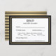 Complétez les invitations de fête noir et or avec des cartes de réponse RSVP élégantes. Tout le libellé de ce modèle est simple à personnaliser ou à supprimer selon les besoins. La carte comprend des choix de repas et la possibilité de répondre via le site web ou par courriel. Le design noir, blanc et or présente une bordure moderne de faux-plaqué, des rayures classiques et une typographie inspirée de l'art déco vintage. Cette carte de note d'annonce est un moyen élégant de demander à vos amis et à votre famille de répondre à votre prochaine célébration de jour spécial. Veuillez noter que l'or est une couleur imprimée, pas une feuille métallique.