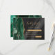 Le bord gauche de cette élégante carte de mariage moderne RSVP est doté d'une bordure en aquarelle vert émeraude, ornée d'une parties scintillant en faux or. Le texte est en écriture manuscrite de couleur or et la police de cuivre sur un arrière - plan d'aquarelle noir. L'envers est assorti d'un design d'agate vert et or.