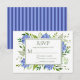 Cette carte de réponse charmante et élégante avec de magnifiques hortensias bleus vaporeux et multicolores et un feuillage vert superbe, ainsi que son verso rayé bleu coordonné, est parfaite pour accompagner vos invitations. Vos invités trouveront facile de répondre à votre soirée de fiançailles. Vous pouvez facilement la personnaliser en sélectionnant "Personnaliser ce modèle" et en saisissant la date limite de réponse. En quelques secondes, vous obtiendrez vos cartes de réponse uniques et superbes !