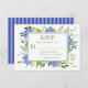 Cette carte de réponse charmante et élégante avec de magnifiques hortensias bleus vaporeux et multicolores et un feuillage vert superbe, ainsi que son verso rayé bleu assorti, est parfaite pour accompagner vos invitations. Vos invités trouveront facile de répondre à votre soirée de fiançailles. Vous pouvez facilement la personnaliser en sélectionnant "Personnaliser ce modèle" et en saisissant votre date limite de réponse. En quelques secondes, vous obtiendrez vos cartes de réponse uniques et superbes !