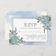 Fleurs d'aquarelle bleu foncé et carte RSVP de mariage feuille fleurie d'hiver. Ce design élégant présente un cadre argenté et des fleurs d'aquarelle bleu poussiéreux avec des feuilles succulents et eucalyptus sur les coins supérieur droit et inférieur gauche et votre texte en gris et noir. Derrière le cadre, il y a un arrière - plan d'aquarelle bleu.