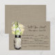 Carte de réponse RSVP assortie, parfaite pour un mariage champêtre ou peut-être que vous aimez simplement les pots Mason ! Pot Mason suspendu à un crochet rempli de fleurs sauvages champêtres. Fond en toile de jute marron rustique avec le pot Mason suspendu et des fleurs sauvages de couleur blanche, jaune crème et vert chartreuse. Si vous avez des questions sur ce design ou si vous souhaitez une modification de couleur, veuillez m'envoyer un courriel à paula@labellarue.com. Vérifiez également les cartes de réponse RSVP, de réception et de placement des invités pour une correspondance parfaite !