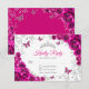 Fuchsia pink silver floral Quinceanera RSVP reply card. Features, script font, silver butterflies, watercolor roses and tiara. Perfect for an elegant princess style glam celebration. Personalize with your own details.