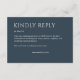 Complétez votre gamme de papier à lettres mariage avec cette carte de boîtier de réponse électronique RSVP conçue simplement pour la typographie et conçue pour coordonner avec notre gamme de papier à lettres mariage "Minimaliste Gras Gras". ● ✦ Entièrement personnalisable et facile à personnaliser. Disponible dans une palette de couleurs soigneusement entretenues, cette carte peut être adaptée à votre thème mariage ou à votre style personnel. Nous sommes là pour vous aider à adapter la conception à vos détails mariages spécifiques - texte, alignement, couleur personnalisée, etc. - et vous aider à créer une suite de papeterie mariage cohésive qui vous est propre.