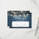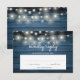 Une carte de réponse rustique avec vos informations dans une typographie chic, avec de jolies guirlandes lumineuses et un fond en panneaux de bois bleu. Conçue par Thisisnotme
