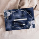 Cette élégante carte RSVP de mariage présente un cadre géométrique argenté orné de bouquets floral bleu marine et argent poussiéreux sur un arrière - plan bleu marine en imitation feuille. Le texte personnalisable combine écriture fantaisie gris argenté et fontes cuivre. L'image de feuille bleue est répétée sur le dos.