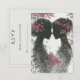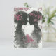 Carte de réponse de mariage mignonne pour couple lesbien, LGBTQ. Deux mariées dessinées à la main, silhouette rose et noire, se tenant face à face avec des accents de feuilles roses. Elles ont les cheveux relevés et des roses roses dans les cheveux, joli dessin au crayon pour votre jour spécial.