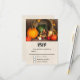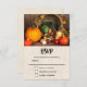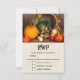 Carte RSVP avec photo d'une récolte d'action de grâce, posée sur une table en bois rustique. Citrouille, pommes de terre, courge etc... composent cette belle collection de nourriture. Des feuilles d'automne colorées entourent le panier de la cornucopie.