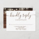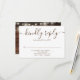 Une carte RSVP rustique avec vos détails en typographie chic et personnalisée avec vos noms et feuillage floral dessiné à la main et les lampes à cordes sur un arrière - plan de panneaux de bois rustique au verso. Conçu par Thisisnotme©