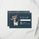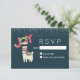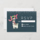 Un RSVP de Noël avec un design fantaisiste. Un joli lama portant des lunettes noires, un chapeau de santa rouge et une écharpe d'hiver festive. Portant également une couverture de style sud-américain et des pompons sur son cou. Le mot Joy écrit au-dessus de sa tête dans une police festive et colorée. Neige tombant du sommet. Sur fond bleu foncé.