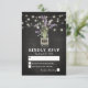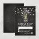 Cartes de réponse de mariage country chic avec un fond de tableau noir craie rustique, guirlande lumineuse, un pot Mason avec des fleurs de lavande violettes, enveloppé dans une toile de jute avec les initiales du couple et un modèle de RSVP de mariage facilement personnalisable.