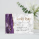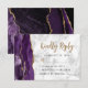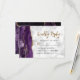 Le bord gauche de cette élégante carte de réponse de mariage moderne comporte une bordure d'agate aquarelle violette ornée de faux éclats dorés. Le texte personnalisable combine une écriture calligraphiée dorée et des polices sans empattement noires sur un fond de marbre gris et blanc. Le verso présente un motif d'agate violet et or assorti.