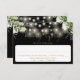 Cette élégante carte RSVP de mariage noir et or, avec de jolies lampes à cordes et de la verdure fleurie, peut être personnalisée avec vos informations dans la typographie chic. Conçu par Thisisnotme©