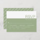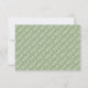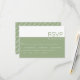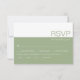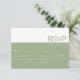 Cette carte de réponse RSVP mariage élégante présente une combinaison enchanteresse de blocs de couleur vert sauge et blanc, créant un design moderne et fantaisiste. La partie supérieure de la carte est joliment décorée dans une teinte blanche, tandis que la partie inférieure dégage une teinte verte sauge rafraîchissante. Le texte RSVP est élégamment affiché en vert sauge sur le bloc blanc à droite, tandis que le texte restant est gracieusement présenté en blanc sur le bloc vert sauge. Le choix minimaliste de polices ajoute une touche de sophistication contemporaine à l'esthétique générale. Pour ajouter un détail charmant, le dos de la carte comporte un motif en diagonale captivant du texte RSVP en blanc contre un arrière - plan vert sage et serein.