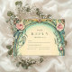 Mélange enchanteur d'élégance vintage et botanique, ce design présente des roses doux et roux entrelacés de feuilles verts sauge et de délicats dégradés bleus. Encadrée dans des courbes ornées d'or et d'ivoire, l'invitation évoque une atmosphère de jardin de conte de fées avec une touche Art Nouveau classique, parfaite pour une célébration mariage romantique et intemporelle.
