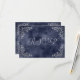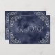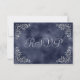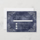 Cette élégante carte d'enceinte RSVP de mariage d'inspiration vintage présente le texte en écriture gris argenté pâle et les polices serif, encadrés par un délicat motif vintage en quatre coins sur un arrière - plan bleu marine aquarelle. Le titre "RSVP" apparaît d'un côté, avec du texte personnalisable de l'autre.