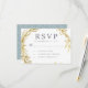 Simple carte RSVP de mariage botanique avec une fausse feuille d'or dessinée à la main sur le devant. Au fond, un arrière - plan bleu pastel avec un subtil motif pétale.