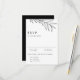 Laissez vos invités RSVP avec cette carte de mariage moderne personnalisable RSVP. Il présente un feuillage minimaliste noir, un script manuscrit et une typographie simple. Personnalisez en ajoutant vos propres détails d'événement. Cette carte RSVP minimaliste de mariage est également parfaite pour les douches nuptiales, anniversaires et autres événements.